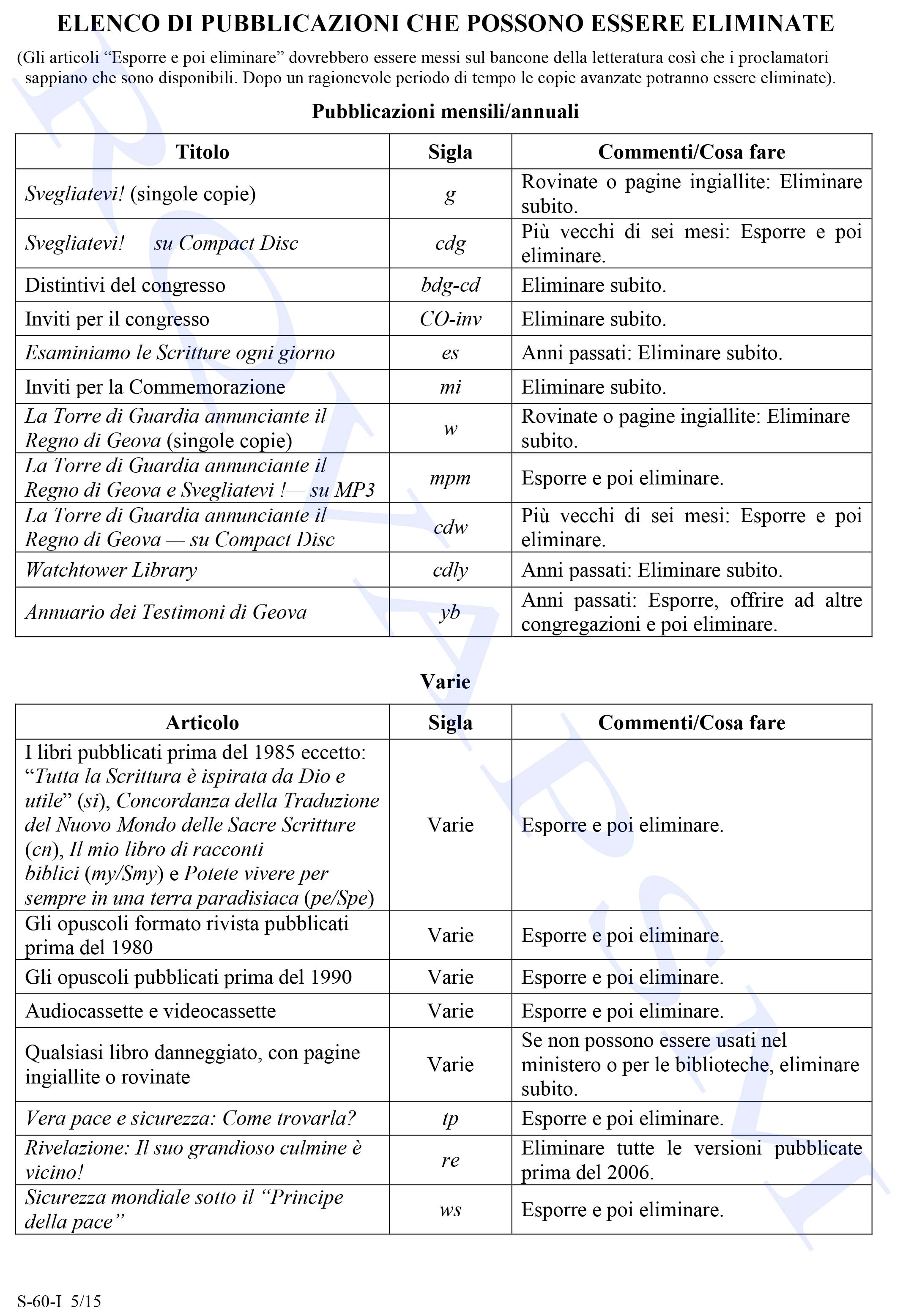 ELENCO DI PUBBLICAZIONI CHE POSSONO ESSERE ELIMINATE. 30/7/2016