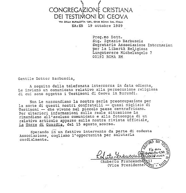 (Lettera inviata dalla Società Torre di Guardia a un anziano siglata EA del 6/4/1987)