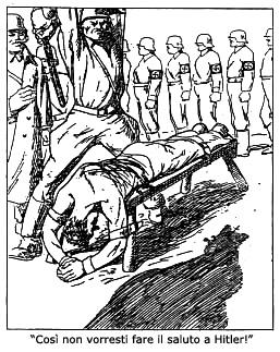 Con questa immagine, la Società Torre di Guardia illustra quello che è stato fatto ai loro fratelli sopravissuti per aver rifiutato di fare il saluto fascista.