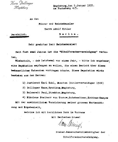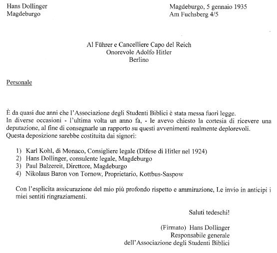 Perché il rappresentante della Società della Torre di Guardia tedesca Hans Dollinger concludeva le sue lettere inviate a Adolfo Hitler con un enfatico “Con saluto tedesco!”, l’equivalente del saluto nazista “Heil Hitler”. Cosa avrebbe da dire oggi l’organizzazione sul fatto che la sua corrispondenza ufficiale era sempre siglata da una tale formula addolcita “compromissoria”?