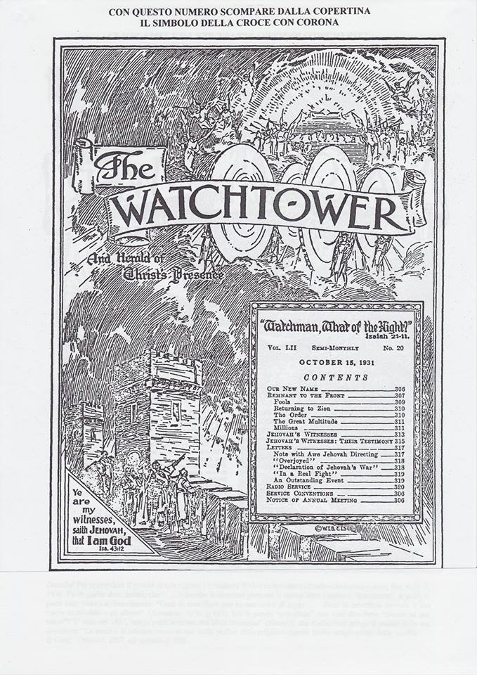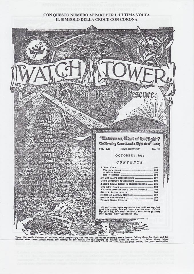 C. T. Russell, arricchì la copertina della rivista Watchtower, con una splendida croce che campeggiava inscritta all’interno di una corona regale, rimanendovi per quarant’anni. Nel 1931, scomparve la croce dalla testata per disposizione del loro presidente Rutherford. Nel libro “Proclamatori” a pagina 200 da loro pubblicato nel 1993 cerca in poche righe di far dimenticare questo fatto agli attuali membri del gruppo quando, esattamente con queste parole, annulla decenni di storia del movimento: “Nel 1936 fu spiegato che l’evidenza indica che Cristo era morto su un palo, non su una croce a due bracci”.