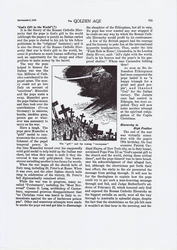 Nella The Golden Age del 9 settembre 1936 a p. 775, vi è una foto dove si vede la mano di Geova che impugna la sua dura e grande forte spada, e dall’alto falcia tutte le croci.