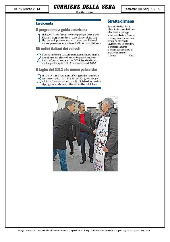 Il Corriere della Sera presenta la notizia del brevissimo incontro del 16-3-2014 tra il M.° Adriano Fontani ed il Presidente del Consiglio Matteo Renzi fuori casa sua a Pontassieve (Firenze).