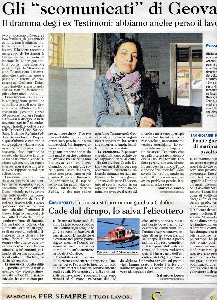 Affetti, amici e lavoro. Ecco cosa ha perso chi a Iglesias ha scelto di rinunciare a Geova.Gli ex Testimoni di Geova raccontano il dramma di cui a Iglesias è vittima chi decide di lasciare la comunità. Impossibile dopo la rottura vedere familiari, amici e persino lavorare. La sorte è toccata a tutti coloro che hanno deciso di fare un passo indietro. “Ho sentito dire da una madre – riferisce una di loro – meglio mio figlio morto che dissociato”.